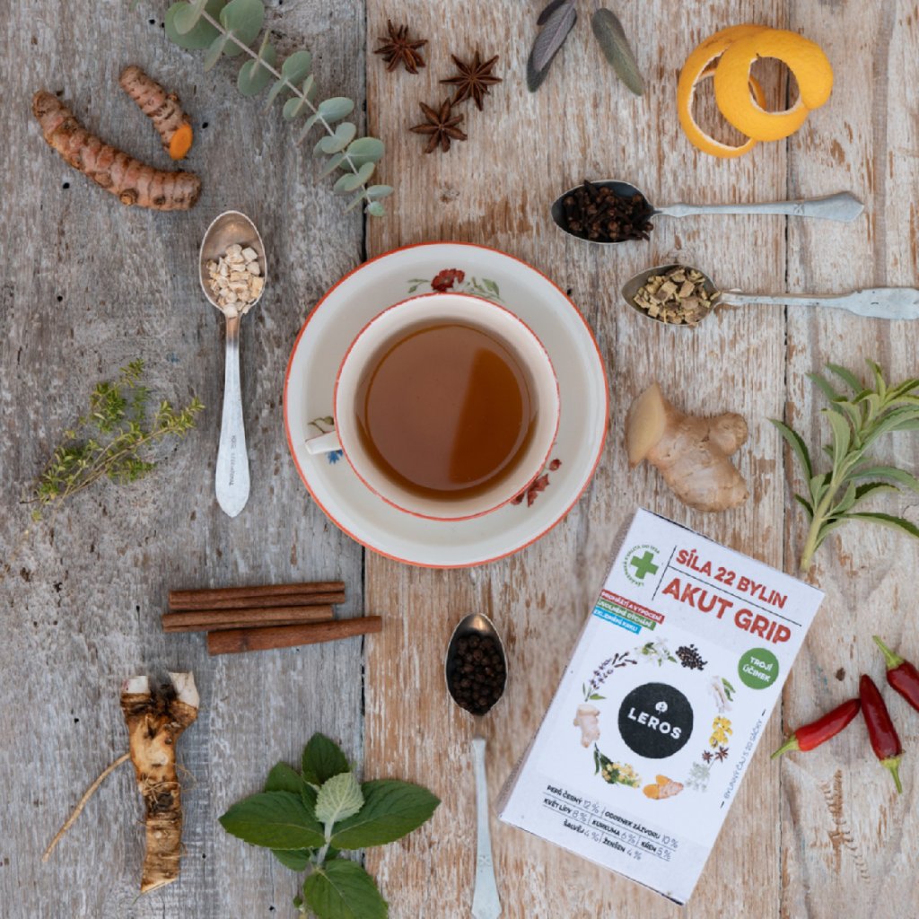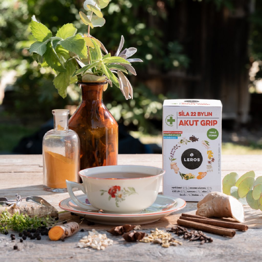 Bylinný čaj LEROS Síla 22 bylin AKUT GRIP je voňavá směs pečlivě vybraných bylin a koření, která přináší hned trojí účinek – příjemně prohřívá tělo a podporuje pocení, ulevuje dýchacím cestám a zklidňuje krk. Díky kombinaci zázvoru, pepře, skořice, lékořice, šalvěje, eukalyptu a dalších rostlin chutná opravdu výrazně a kořenitě, jemně doplněné citrusovou svěžestí.