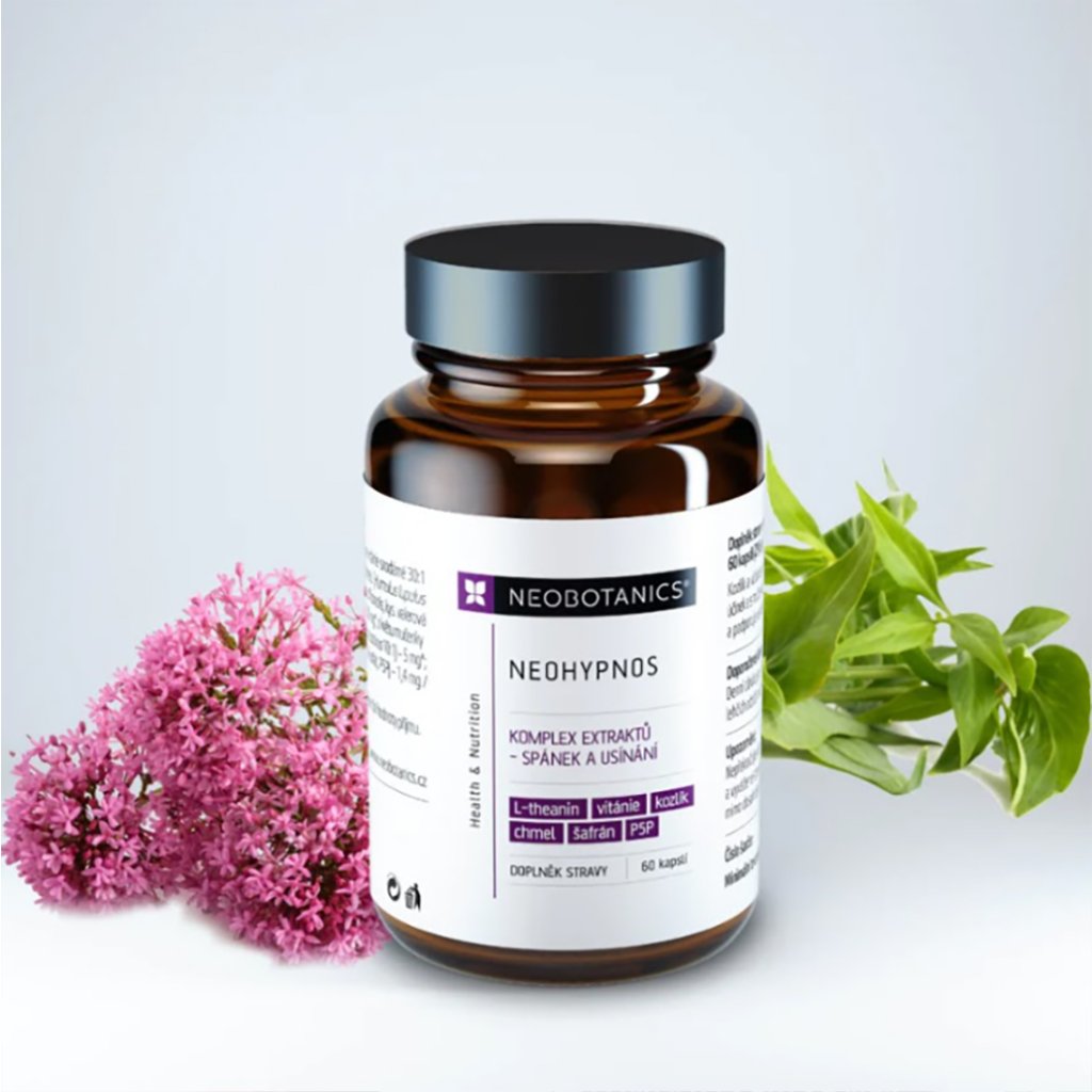 Složení: NEOHYPNOS TM Botanical Complex: rostlinné extrakty z kořene vitánie snodárné 30:1 (Withania somnifera, withanolid ≥2.5%) – 200 mg*, z šištic chmelu (Humulus lupulus 10:1) – 120 mg*, z kořene kozlíku lékařského 10:1 (Valeriana officinalis, kys. valerová ≥0.8%) – 100 mg*, z listu meduňky (Melissa officinalis 10:1) – 100 mg*, z květu mučenky (Passiflora incarnata 10:1) – 100 mg* a květu šafránu (Crocus sativus 10:1) – 5 mg*; L-theanin (ze zeleného čaje) – 160 mg*, vitamin B6 (pyridoxal-5‘-fosfát, P5P) – 1,4 mg / 100% RHP**; kapsle: hydroxypropylmethylcelulóza. *Obsah účinné látky v denní dávce – ve 2 kapslích. **RHP – referenční hodnoty příjmu.