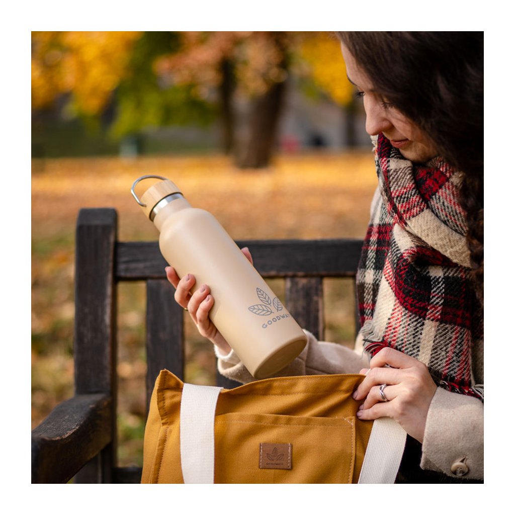 GoodFlask lahev se skládá z dvouvrstvé lahve z nerezové oceli a bambusového víčka s kovovým poutkem. Dvouvrstvá stěna s vakuovou izolací udrží vaše nápoje teplé nebo studené po celý den i v extrémních teplotách! To jako vážně při pokojové teplotě až 24h!