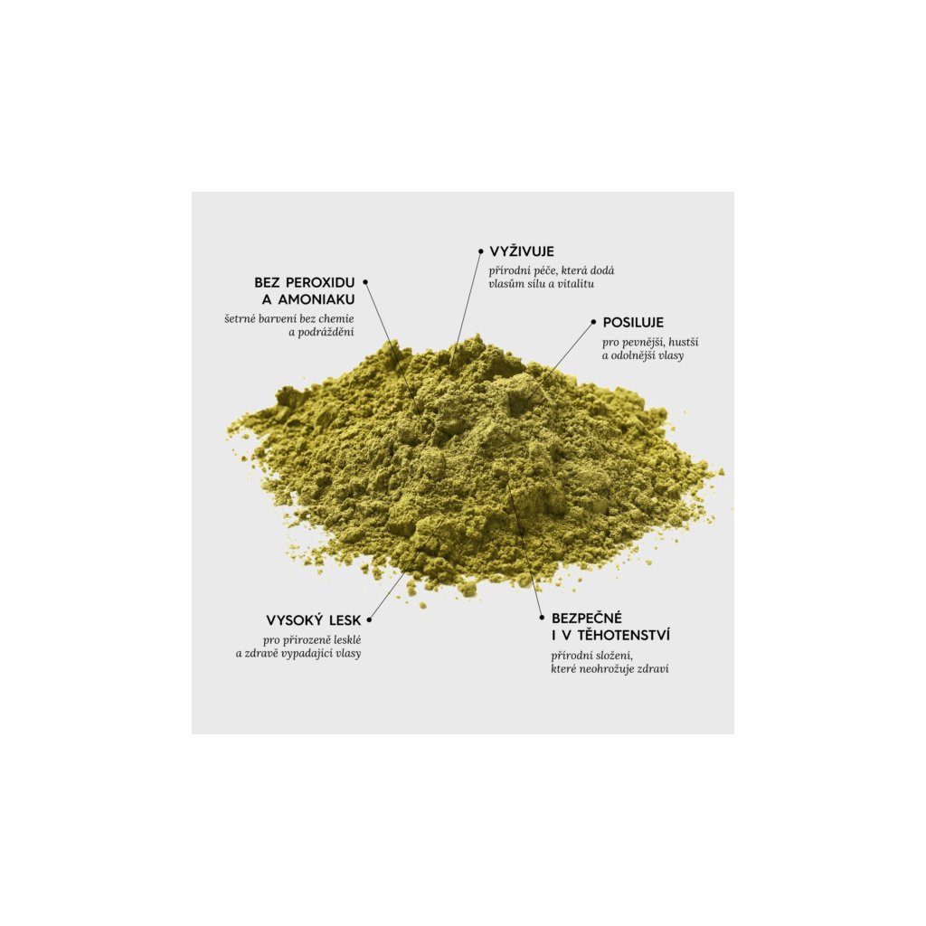 Použití: Prášek zalijte vodou o teplotě max. 50 °C. Barvu stačí mít na hlavě 45 min. Detailní návod k použití najdete v příbalovém letáku. Finální výsledek samozřejmě závisí na vašem předchozím barevném odstínu. (100 g)