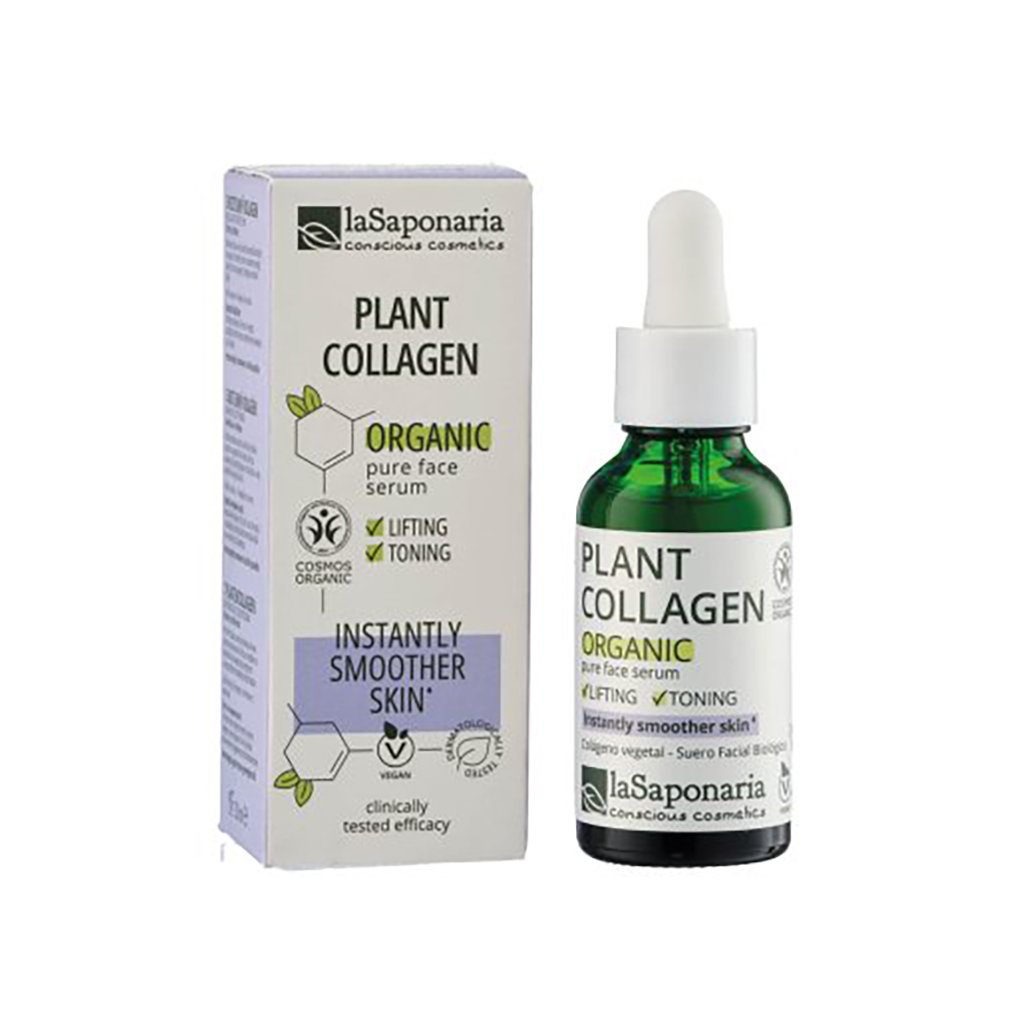 laSaponaria BIO pleťové sérum s rostlinným kolagenem představuje ideální péči pro vyhlazenější, pevnější a pružnější pokožku s jemným liftingovým efektem. Obsahuje výhradně přírodní rostlinný kolagen získávaný z extraktů ovoce Kigelia Africana a kůry Quillaja Saponaria, jež pomáhá redukovat jemné vrásky a známky předčasného stárnutí. Sérum je doplněné o bio aloe vera a borůvkovou vodu, rychle se vstřebává bez mastného pocitu, neobsahuje přidané parfemace a hodí se také jako podklad pod make-up. Účinky jsou potvrzeny klinickými testy i certifikací Cosmos Organic.