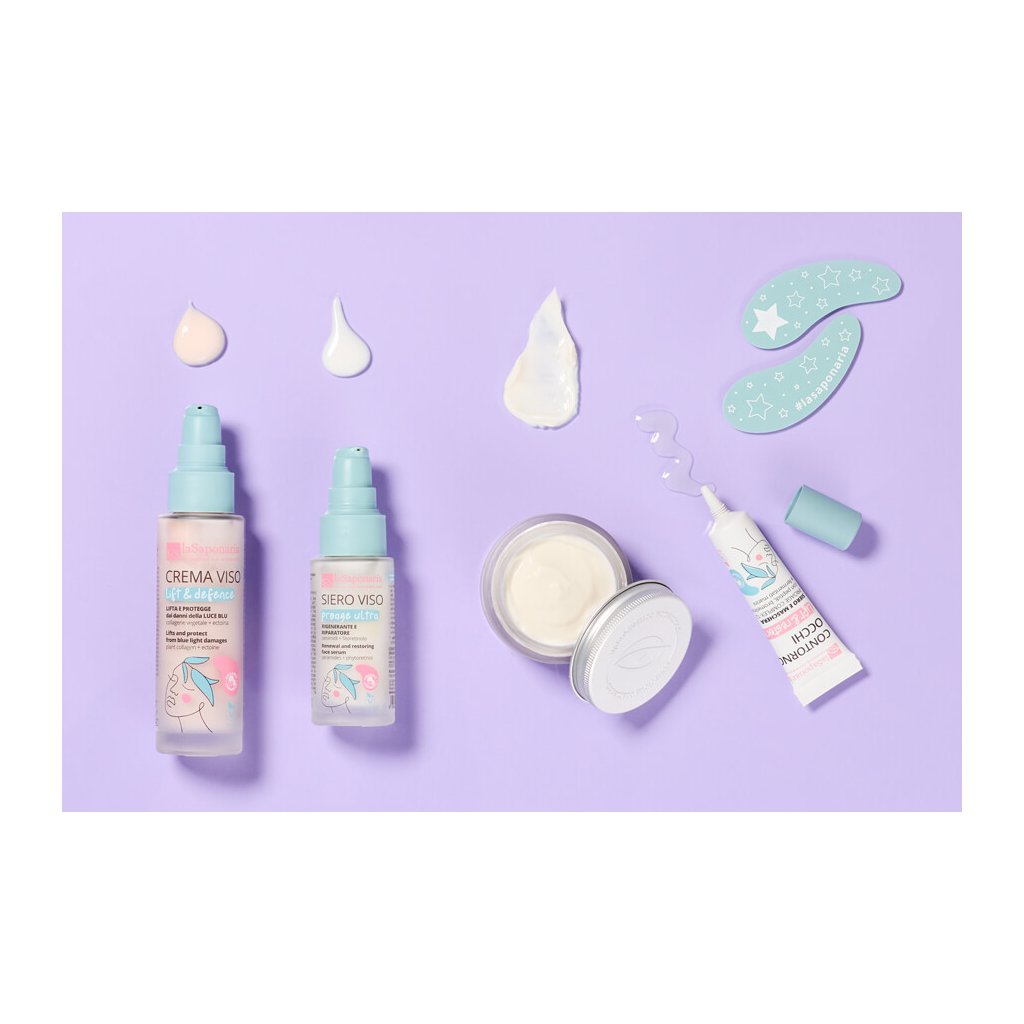 Tento organický a dermatologicky testovaný krém od italské laSaponarie je určen pro denní péči o všechny typy zralé pleti. Má viditelný vypínací a vyhlazující účinek a zároveň o zralou pleť pečuje, hydratuje ji a chrání před poškozením modrým světlem a UV zářením. Klíčovými složkami jsou rostlinný kolagen, který pleti poskytuje viditelný lifting již během 45 minut od aplikace, mořské fermenty, které vyhlazují vrásky a zvyšují pevnost pleti a ectoin, jež zabraňuje ztrátě hydratace pleti a chrání ji proti vnějším vlivům. Krém má příjemnou texturu a byl testovaný i na citlivou pleť.