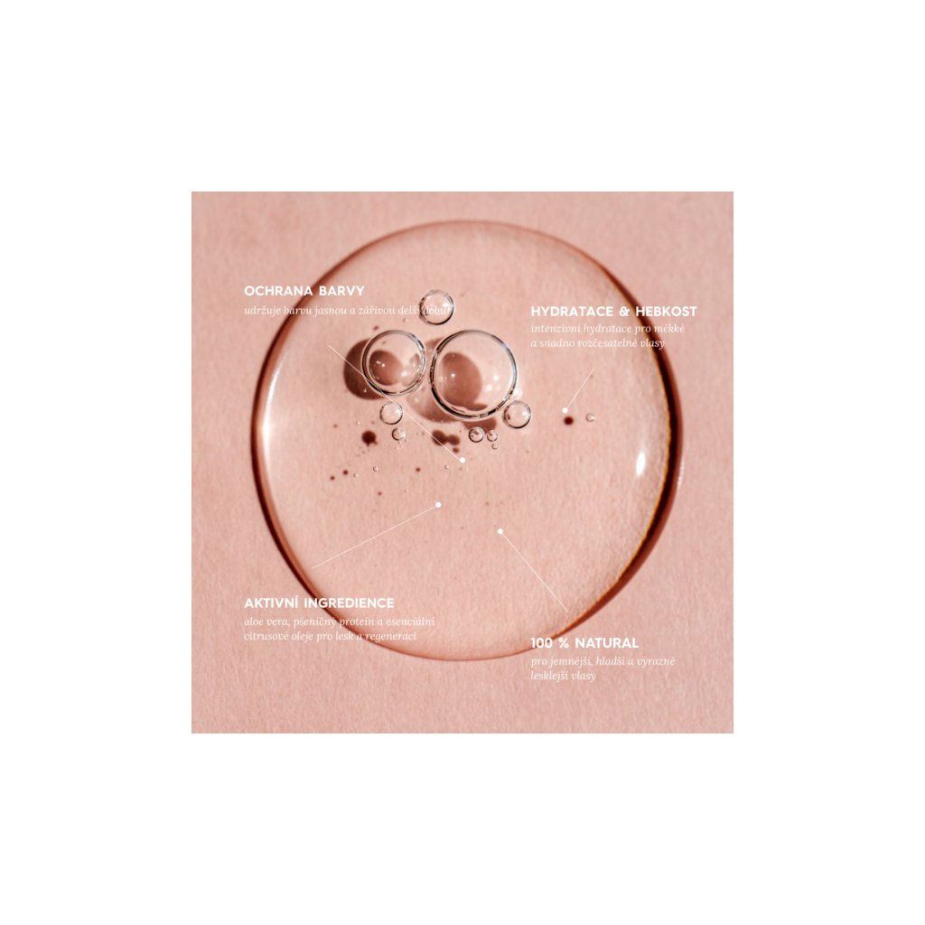 Jemný přírodní šampon speciálně vyvinutý pro barvené vlasy. Šetrně čistí vlasy i pokožku hlavy, aniž by docházelo k nadměrnému vysušování nebo vyblednutí barvy. Pomáhá udržovat přirozenou rovnováhu vlasové pokožky, dodává vlasům hydrataci, hebkost a intenzivní lesk, přičemž barvu zachovává jasnou a zářivou po delší dobu. Pravidelným používáním zanechává vlasy svěží, lehké a snadno rozčesatelné.