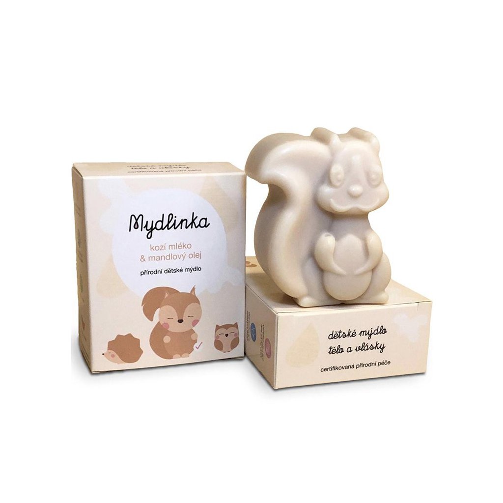 Dětské přírodní mýdlo s kozím mlékem veverka Mydlinka je ručně vyrobené z přírodních olejů metodou za studena. Dle Státního zdravotního ústavu jej mohou používat už děti od narození na tělo i vlásky. Je vynikající také pro alergickou, ekzematickou a extra jemnou pokožku.