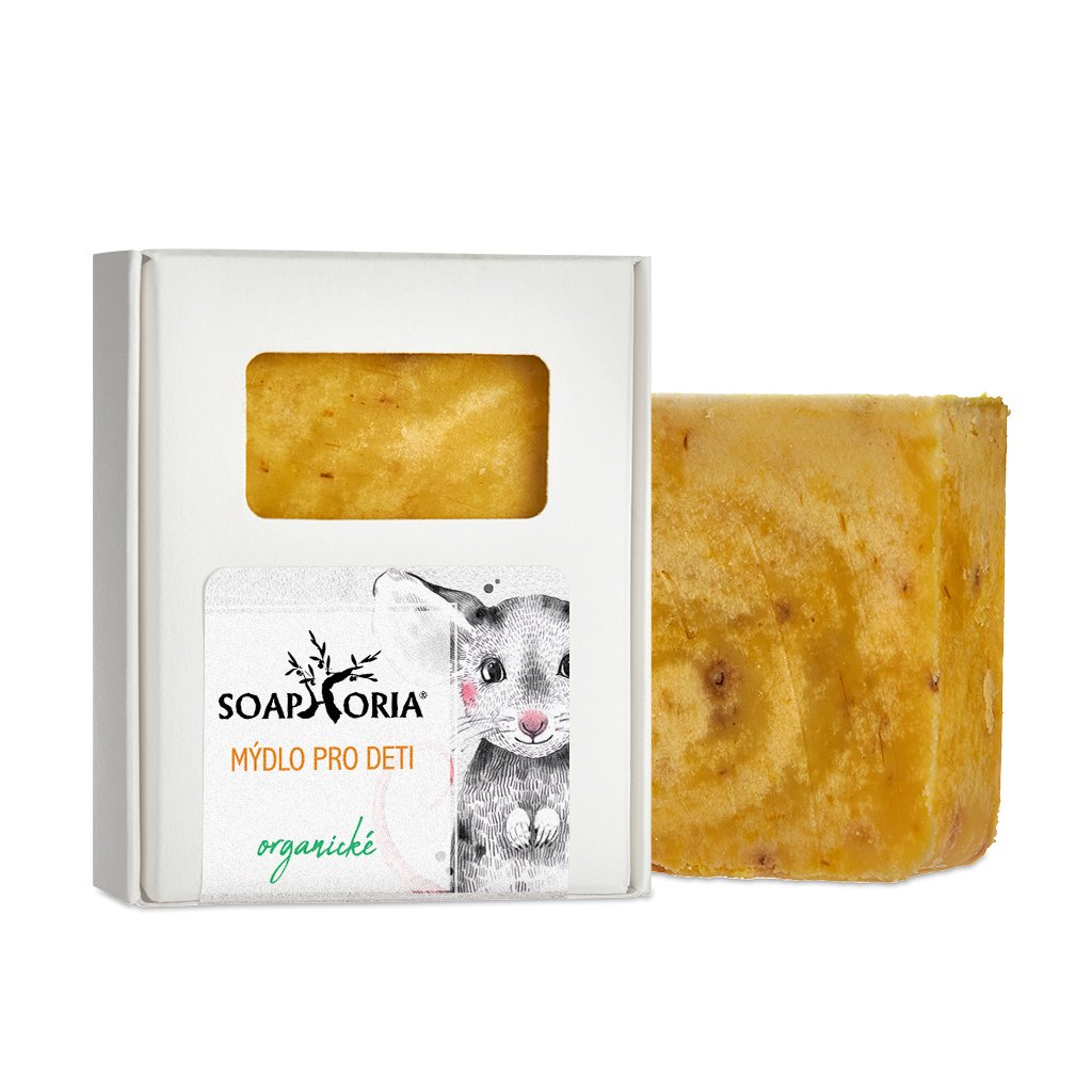 Soaphoria nabízí i úžasnou řadu pro děti, mezi tyto produkty patří i organické mýdlo určené k ošetření té nejjemnější dětské pokožky. Základní složkou mýdla je Kokosový, Olivový, lněný a Konopného olej. Toto složení je ještě obohaceno o neustále opěvované Bambucké máslo a přírodní maceráty zlatožlutý mrkvový a hojivý měsíčkový. Díky tomuto unikátnímu složení je toto dětské mýdlo opravdu jemné a čistí dětskou pokožku bez vysoušení a podráždění.