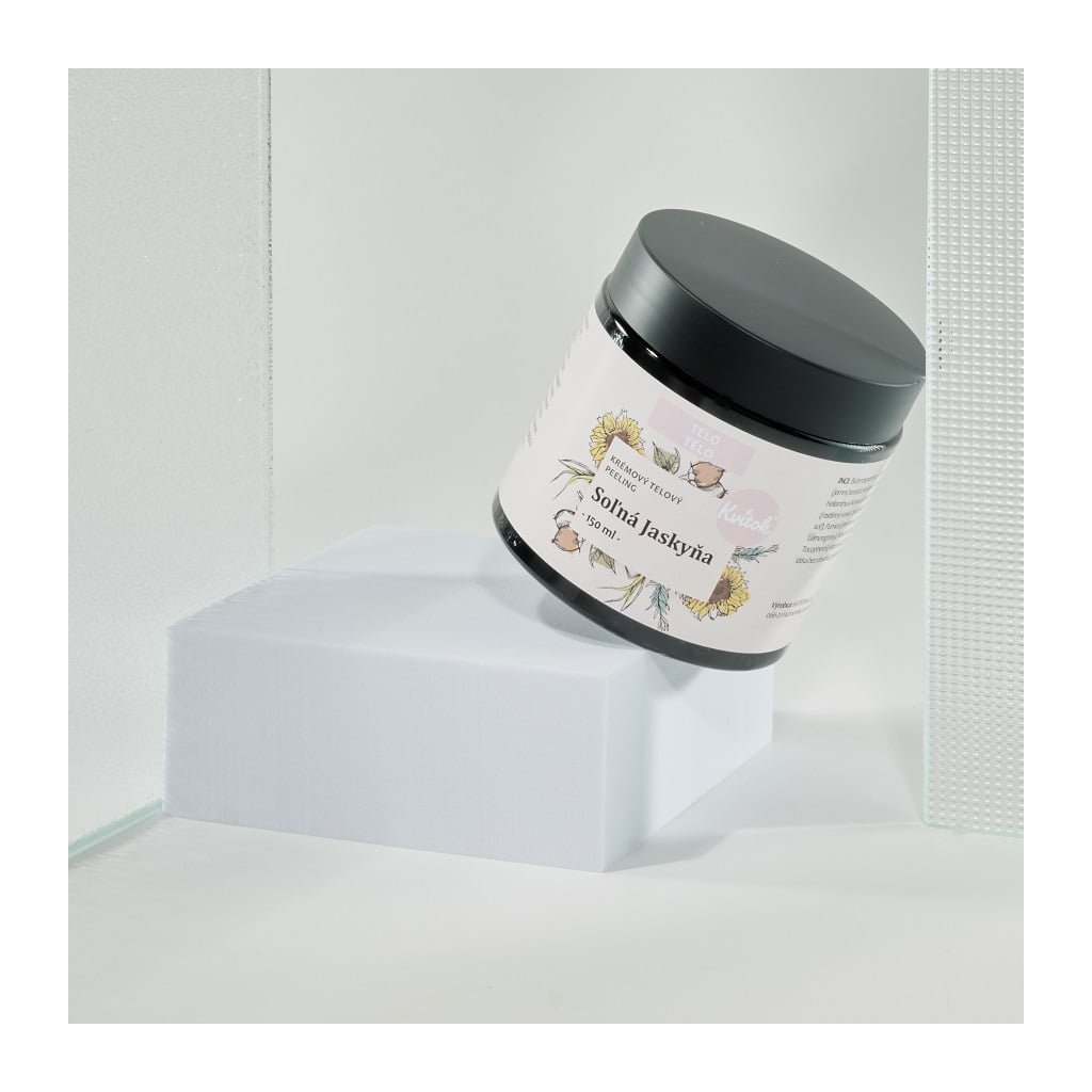 Tělový peeling Solná jeskyně s velmi příjemnou jemnou vůní můžete celému vašemu tělu dopřávat jednou týdně, častěji pak tam, kde je pokožka hrubší, tedy vaše paty, lokty nebo kolena. Složení je založené na bambuckém másle a slovenském slunečnicovém oleji. Ty po smytí peelingu zanechají na pokožce lehce mastný film a pokožka tak zůstane hydratovaná.