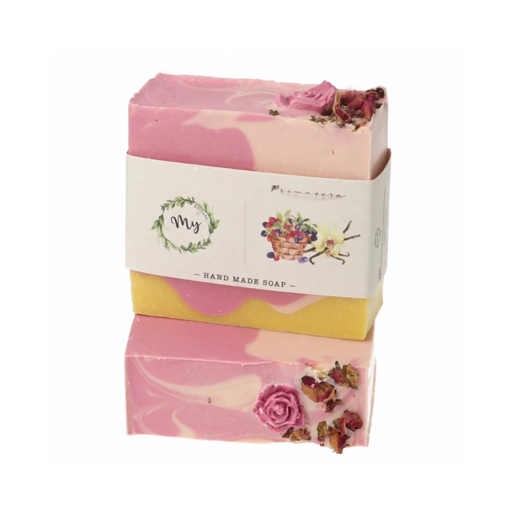 Mýdlo z kokosového oleje a bambuckého másla s romantickým designem a ručně vyrobených detailů.