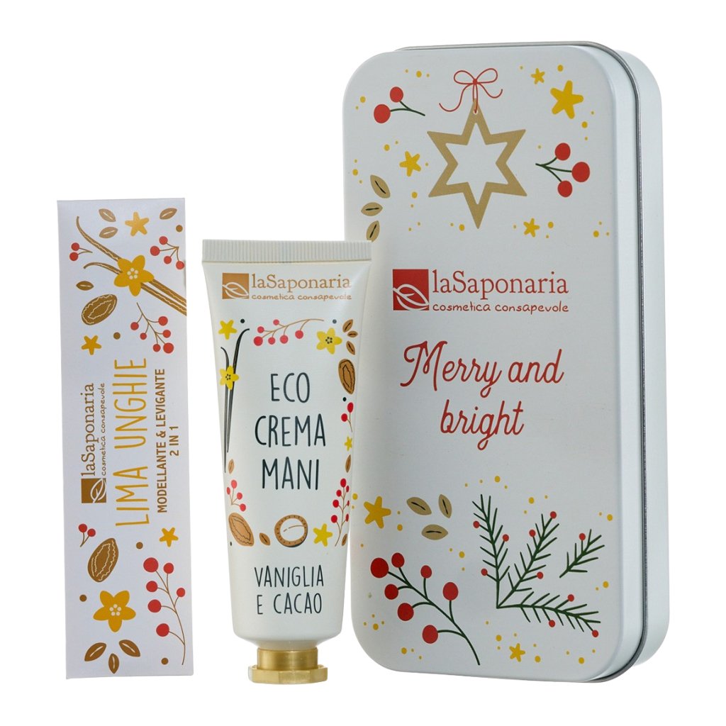V krásné plechové krabičce najdete poklady, které pěstí pokožku rukou a pomohou s úpravou nehtů. Krém s nebeskou vůní vanilky vyživuje a chrání ruce díky svému bohatému složení a udržuje je jemné, voňavé a připravené čelit i nejchladnějším dnům. Praktický pilník na nehty 2v1 nadchne nejen krásným designem, ale také udržitelným a pružným jádrem ze dřeva, co se přizpůsobí každému tvaru nehtu. Krém i pilník budou neocenitelnými parťáky i na cestách. Půvabnou plechovou dózu využijete například v kuchyni nebo na drobné radosti.