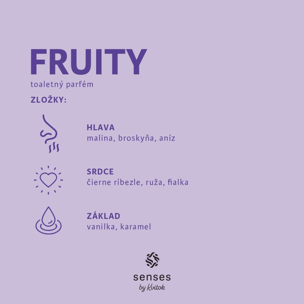 Unikněte do světa fantazie a zábavy s hravou vůní Fruity, která přináší optimismus a vyvolá skvělou letní náladu i během chladnějších dnů. Ovocné tóny malin a broskve pozvolně přecházejí do květinového srdce doplněného pronikavou vůní rybízu a doplňují tak vanilkovo-karamelový základ.