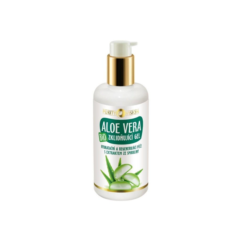 Bio Aloe vera gel PURITY VISION jsme obohatili o extrakt ze sladkovodní řasy spiruliny, která pokožku chrání před okolními vlivy a detoxikuje ji. Gel se snadno roztírá, na pokožce vytváří chladivý efekt a poskytuje jí potřebnou hydrataci a výživu. Obsažená Bio Meduňková a Bio Heřmánková voda dodává gelu příjemnou vůni. Blahodárné účinky Aloe vera jsou známé již po staletí. Dopřejte svému tělu porci přírodní péče s Bio Aloe vera i Vy.
